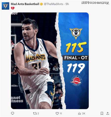 北京时间11月14日,g联赛继续进行,印第安纳疯狂蚂蚁115-119惜败汽车城巡游队,这场比赛疯狂蚂蚁一度落后22分在下半场疯狂追分,最终只惜败4分已是不易。