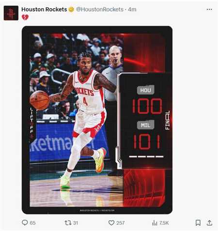 火箭100-101惜败雄鹿。终场前3.9秒利拉德完成了准绝杀突破,随后老里布置了一个提前犯规战术,乌度卡用掉最后一个暂停画出2秒的边线球战术,申京脱手比赛结束。