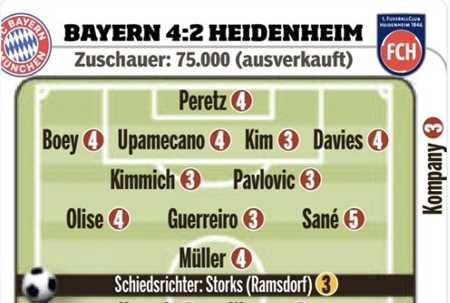北京时间12月7日晚,德甲第13轮,拜仁慕尼黑在主场4-2战胜海登海姆。赛后,《图片报》对拜仁球员的表现进行了评分。