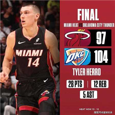 一是今天结束的一场常规赛,热火主场97-104不敌雷霆,这场巴特勒只打了7分钟伤退,泰勒希罗交出尽力局:
