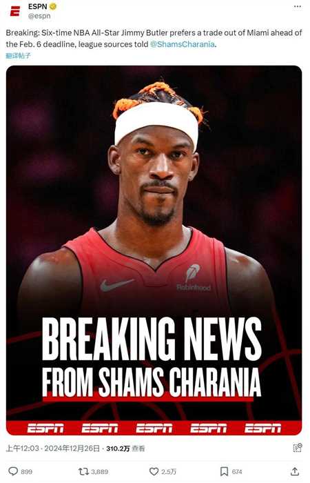 北京时间12月26日,有一个球员抢了圣诞大战的热度,他就是巴特勒。今天凌晨,据nba名记shams报道,巴特勒希望在交易截止日(2月6日)之前离开热火队,他想要被交易到西部,有4个指定下家:太阳、勇士、独行侠和火箭。
