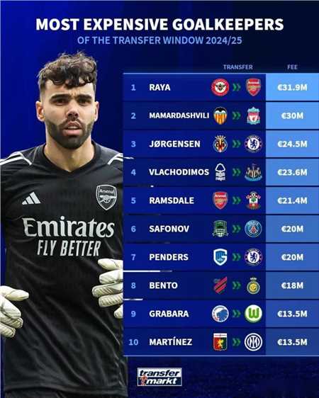 1.戴维-拉亚 布伦特福德→阿森纳 3190万欧元