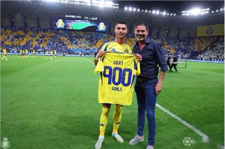 利雅得胜利官方向c罗赠送了一件纪念他在职业生涯中打进900球的球衣,球衣上印有“goat(史上最佳)”和“900个进球”等字样。