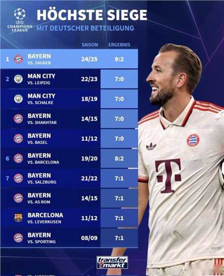 拜仁慕尼黑在欧冠联赛阶段的首轮比赛中主场9-2狂胜萨格勒布迪纳摩,赛后德转统计出了德甲球队参与的欧冠最大比分比赛,拜仁在前10位中占据7席,并且全部获胜。