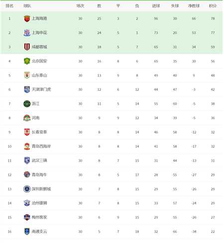 中超联赛积分榜